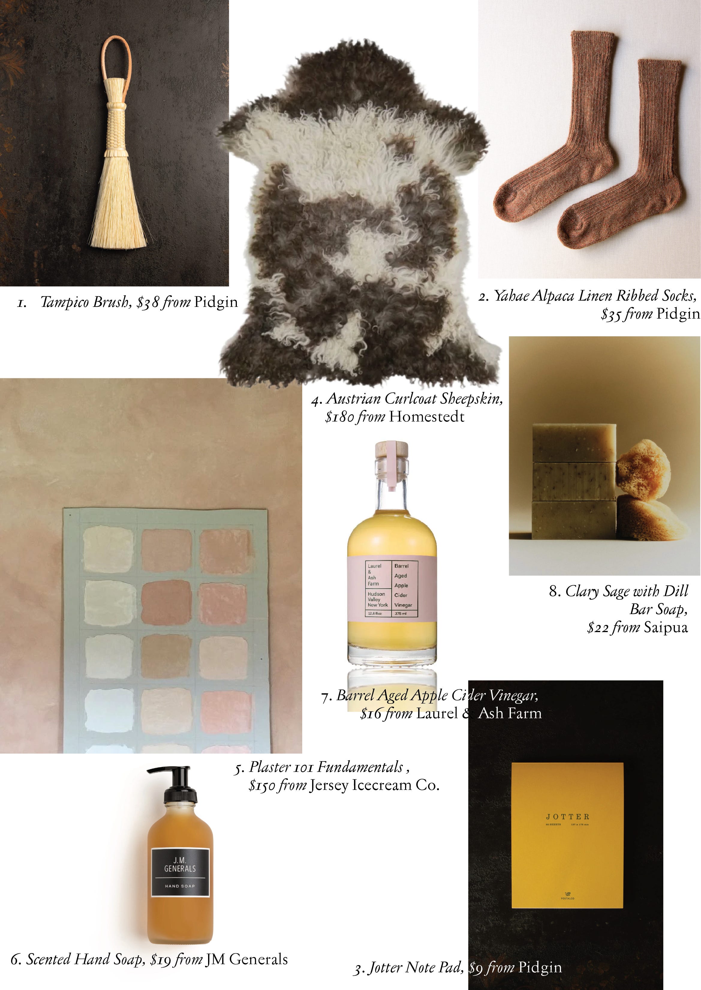 Kostas Anagnopoulos opened his shop, Pidgin, right around the time I demo’d the first wall in my then recently-purchased Catskills home. I often found myself inspired by his shop during my renovation. Located on the other side of the Catskills, Pidgin may be the most pleasing home-oriented shop I know of. If you can’t squeeze in a quick drive up the Hudson, Pidgin now has a lovely online store. I recently purchased a Tampico Brush, $38, Alpaca Linen Socks, $35, and a Jotter Note Pad, $9. Just a few things to tide me over until my next trip over to Oak Hill.